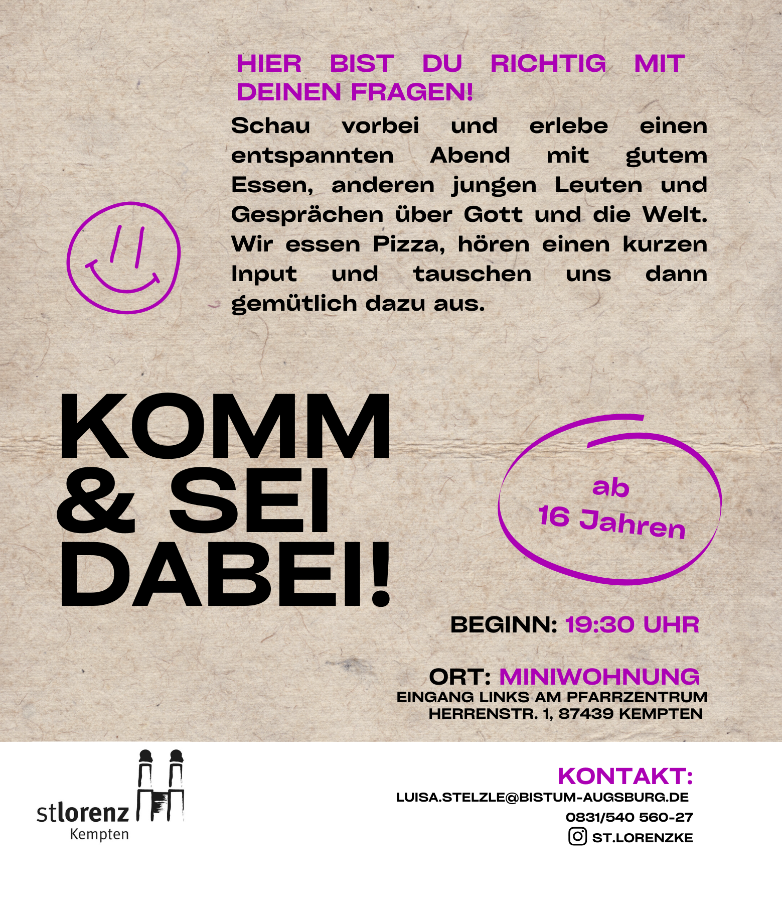 Schau vorbei und erlebe einen entspannten Abend mit gutem Essen, anderen jungen Leuten und Gesprächen über Gott und die Welt. Wir essen Pizza, hören einen kurzen Input und tauschen uns dann gemütlich aus.